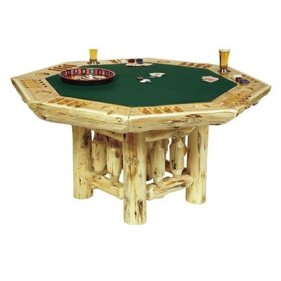 Fireside Lodge 16700 / 16140 Made from hand-peeled Northern White Cedar logs. Hand peeling leaves the natural character and beauty of the log intact and gives a more rustic appearance. Traditional Cedar Log Poker Table Set with Log Framework Base Features: -Set includes poker table and four side chairs. -Clear coat catalyzed lacquer finish for extra durability. -Dining table cover with standard finish or liquid glass finish. -White cedar construction. -Individually hand crafted. -Eight sided custom poker table. -Scooped poker chip and drink holders. -Premium felt top. -Log framework base. -Northern white cedar logs are hand peeled to accentuate their natural character and beauty. -Black walnut inlays on each angle of the top. -Flared tree stump base for beautiful natural character. -Traditional Cedar Log collection. -Fireside Lodge provides two year limited warranty. -Made in the USA.