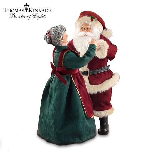 Music and motion are delightfully combined in a unique Christmas decoration inspired by the beloved holiday artwork of Thomas Kinkade, available exclusively from The Bradford Exchange Both Santa and Mrs. Claus are handcrafted in artist's resin with hand-painted features, and Mrs. Claus has beautifully sculpted, wavy hair Real fabric costume details, faux fur and fancy trims add to the realism of this charming scene between Santa and his Mrs. Santa's beard and hair are soft plush with a realistic weathered look We offer generous guarantees on everything we sell - up to 365 days on select items! If you need to make a return, you'll receive 100% of everything you paid.