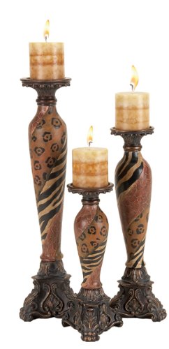 Delight the spaces with dancing lights. 40281 Polystone Candle Holder S/3 is an excellent anytime low priced decor upgrade option with great utility for everyone. *Size: 21,16,12 inch high *Material: Polystone *Color: Brown as shown in picture * Set of three; Classic modern home decor; Hard to be seen elsewhere; Exclusively designed for limited edition Adds charm to any d?cor Made of Resin Features set of 3 Zebra & Leoprd Print pillar candleholders Pair with our other Durban safari themed accessories Height of each: 21", 16" and 12"