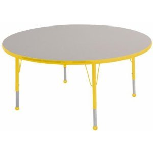 ECR adjustable leg activity tables feature 1.125" thick tabletops with laminate on both the top and bottom. Color-coordinated powder-coated upper legs, edgebanding, and matching polypropylene ball glides in the most popular classroom colors (Gray Nebula with Blue, Red, Yellow or Green and Wood-Grain with Black). Will not fade or discolor. Safe, non-toxic, stain-resistant and easy to clean. Product Dimensions 48" Diameter Tabletop. Laminate table tops are 1.125" thick, and are laminated on both sides. Colors:RD=Gray Nebula/Red,BL=Gray Nebula/Blue,YE=Gray Nebula/Yellow,GN=Gray Nebula/Green,WG=Wood Grain/Black. Color-banding grips into the tabletop. Color banding is made from PET and contains no phthalates. The table substructure is made from medium-density particleboard (47 lb/ft³) that is at least 90% recycled (minimum 4% post-consumer, balance pre-consumer). EPP certified, CARB compliant and may contribute to US Green Building Council's LEEDTM Credits. 18 gauge galvanized steel stability bars, with poly caps, installed on underside of all 66" - 72" length tables. Superior shipping materials meet or exceed ISTA regulations. QSG Warranty. Powder-paint coated upper leg. Chrome-plated adjustable lower leg insert. Legs are adjustable in 1" increments. Threaded adjustment holes in chrome lower leg keeps legs securely in place. Color coordinated polypropylene ball glides are standard (Traditional nickel-plated self-leveling glides are available for an additional charge).Quality Satisfaction Guaranteed Easy mount leg installation with pre-installed brackets and pre-drilled screw holes for easy alignment. Toddler Leg size (15"-23").
