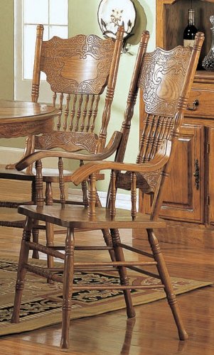 Mackinaw Victorian Press Back Dining Arm Chair - Set of 2. Coaster realizes the importance of your home which is why they have an endless variety of furniture in countless styles and designs. The designs are capable of fitting the needs all around the home and the quality is at a level you can trust. A Victorian style side chair featuring a splat back pressed design and turned spindles. Set of 2. Assembly Required. Dimensions: 20.75" L x 16.5" W x 42" H; 43.898 lbs. Dimension: 16 1/2"L x 20 3/4"D x 42"H Finish: Oak/ Solid Wood Set of 2 Dining Arm Chairs with Double Press Back Oak Finish Fully Assembled
